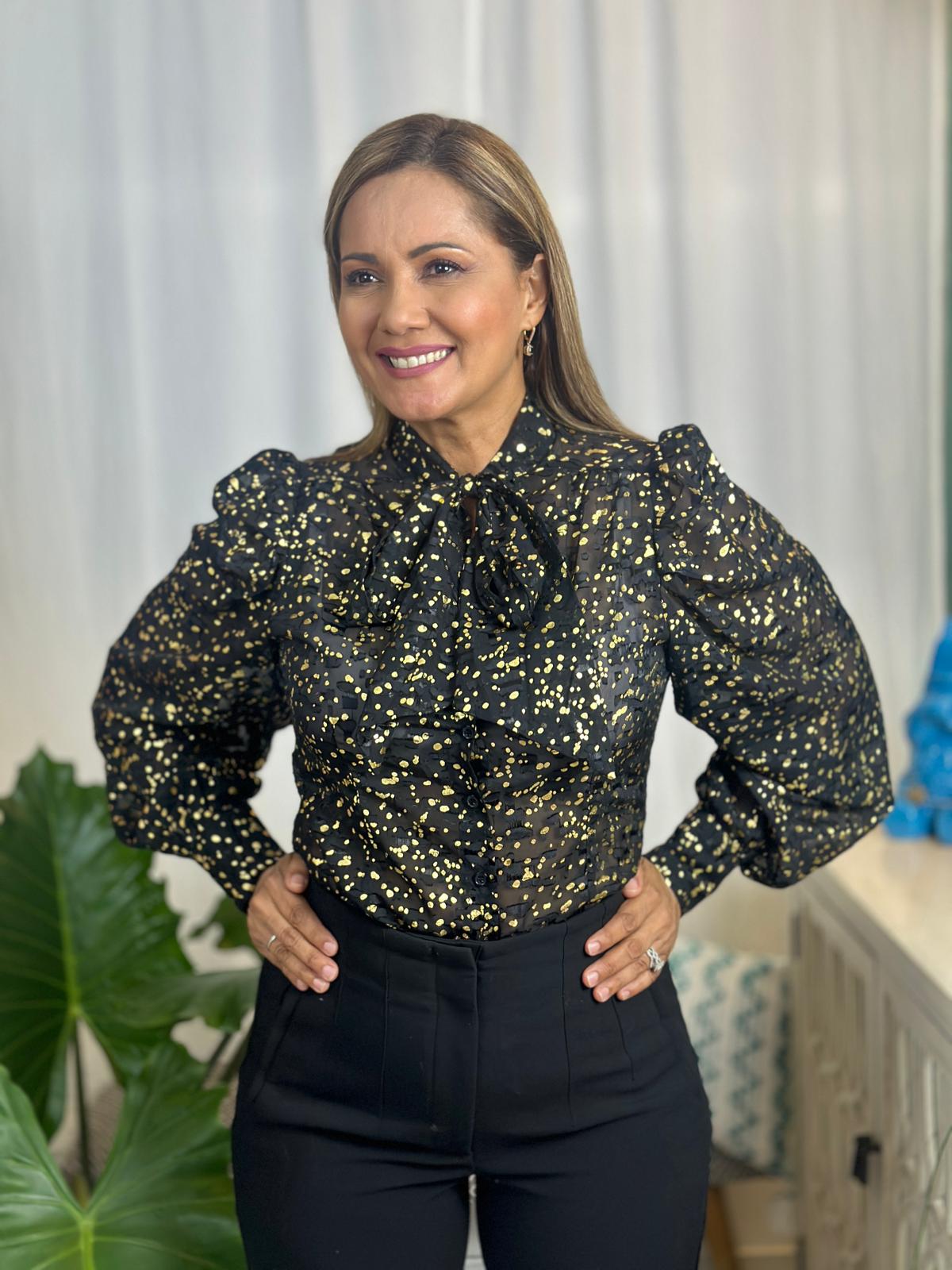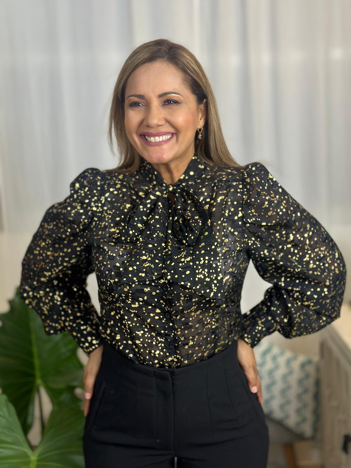 This burnout splatter foil button down blouse features a unique design of gold and black burnout pattern with a front bow tie, see-through effect, long puff sleeve with cinched waist, and V-neck. It is designed to fit and flatter the body without stretching.