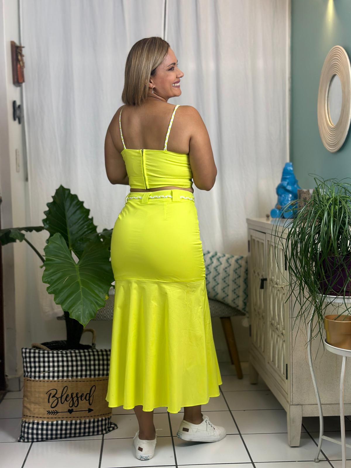 The Destellos Braid Detail Skirt Set features an elegant and casual braid detail to give you a fashionable look. The set includes a heart crop top made from flexible spandex, letting you stay comfortable all day. This beautiful set is color-blocked in light lime for a sophisticated yet casual look.