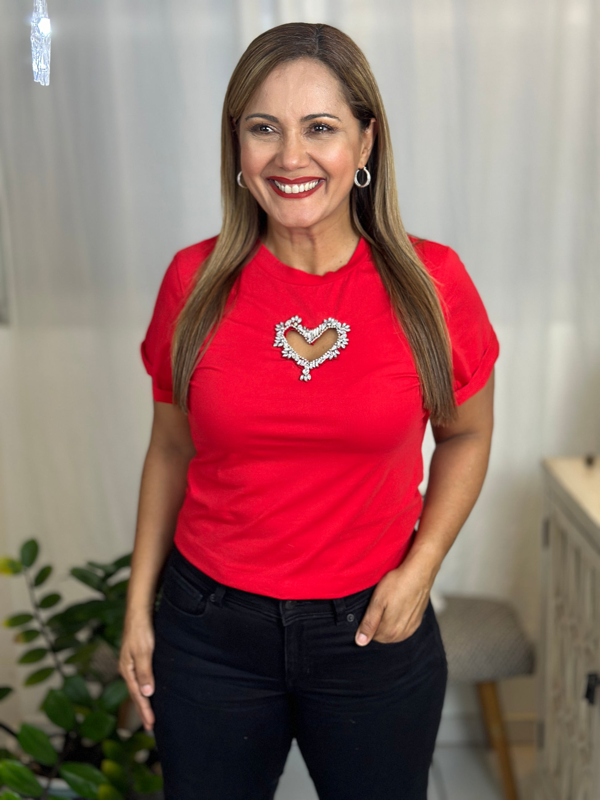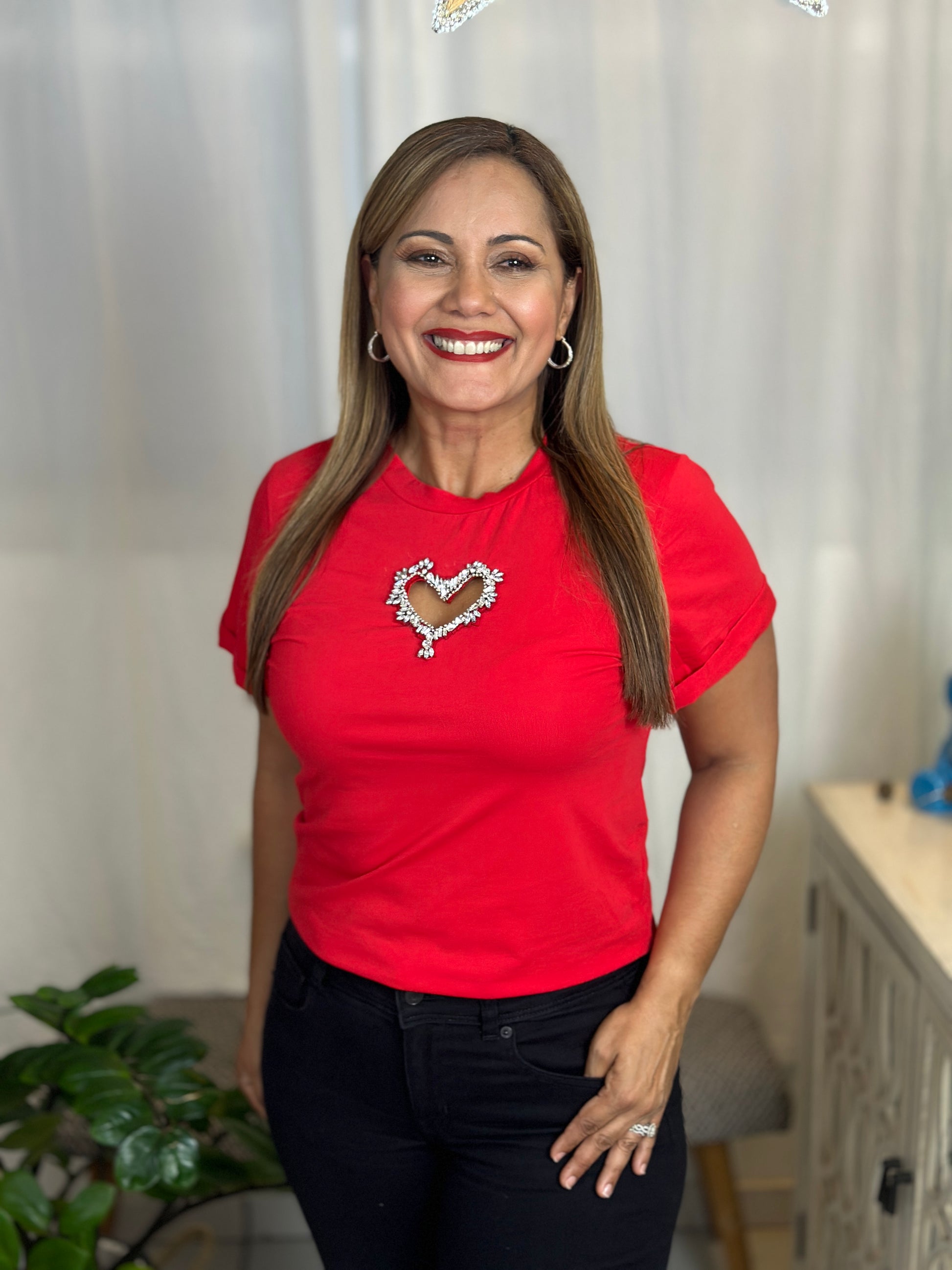 Achieve a casual and comfortable look with a touch of romance in our Destellos Heart Detail Top. Adorned with rhinestone heart details, this top will bring joy and add a hint of sparkle to your wardrobe. Perfect for any occasion, it's a must-have for those seeking a happy and pretty style.