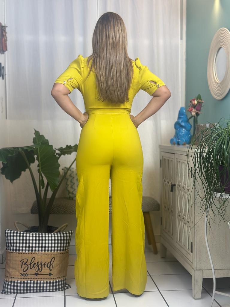 Be fashionable and original with the Destellos Puff Color Jumpsuit. Crafted with spandex for a comfortable fit, wide legs, faux pockets, and short puff sleeves, this jumpsuit comes in eye-catching mustards and magentas, available in sizes Small, Medium and Large. Transition effortlessly from day to night and stand out from the crowd in this modern and stylish jumpsuit.