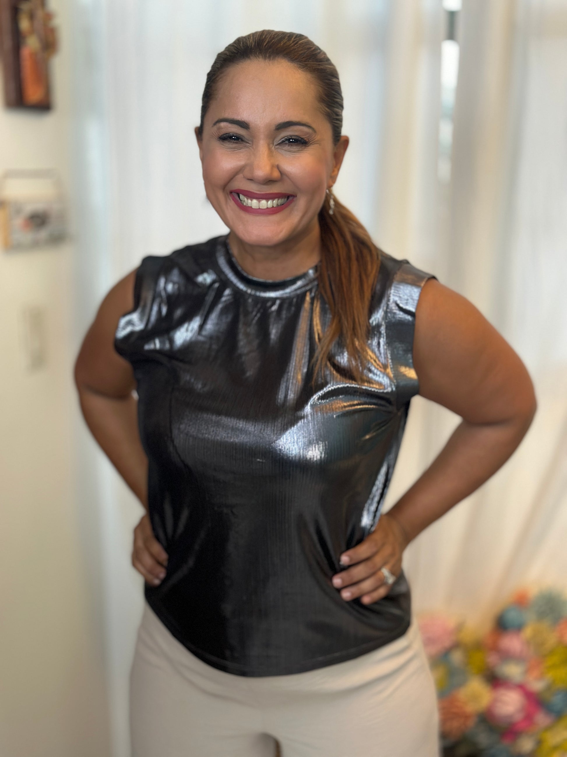 Sparkle your shine in this beautiful and confortable silver top. Feel confident and be yourself.