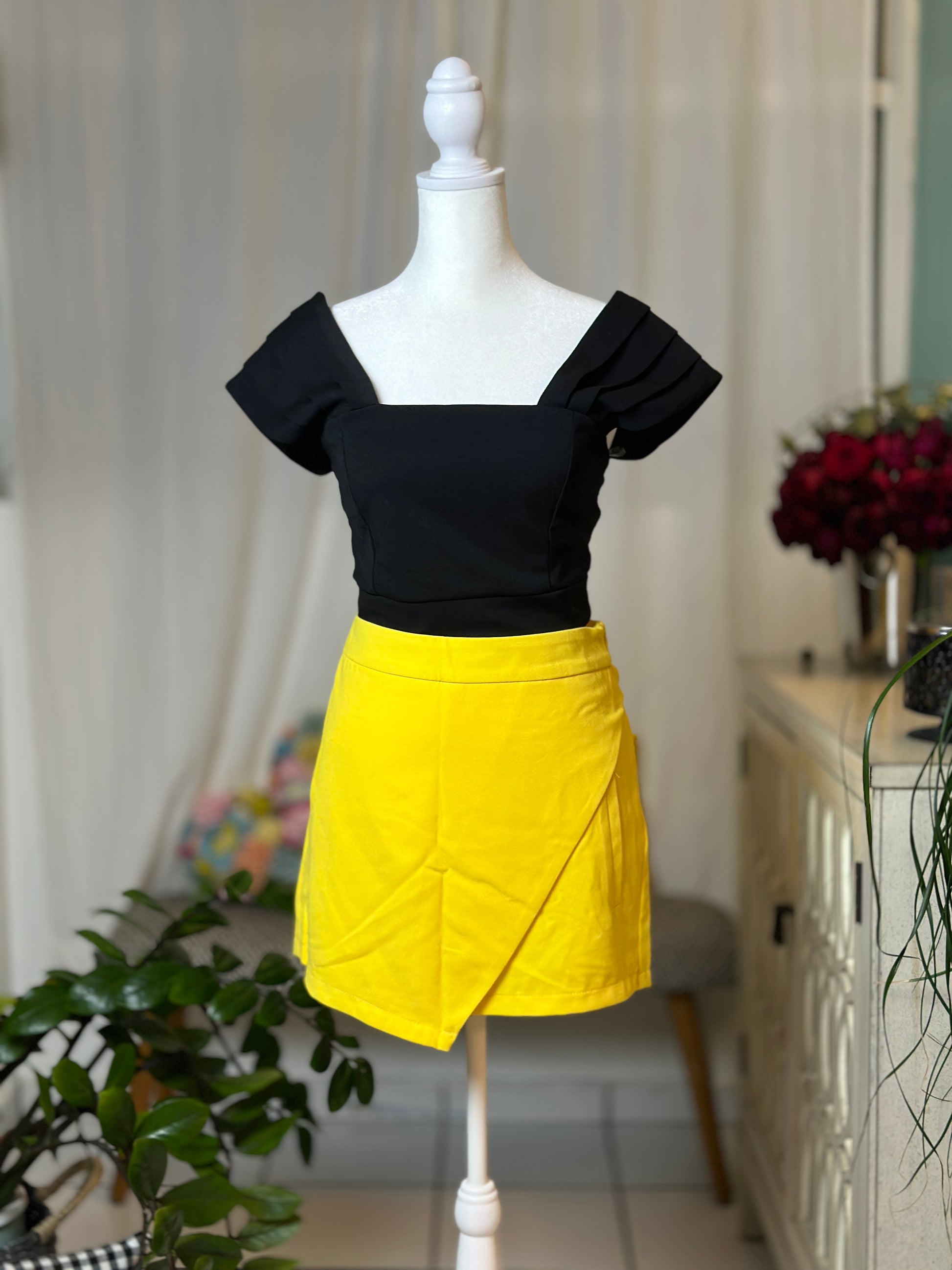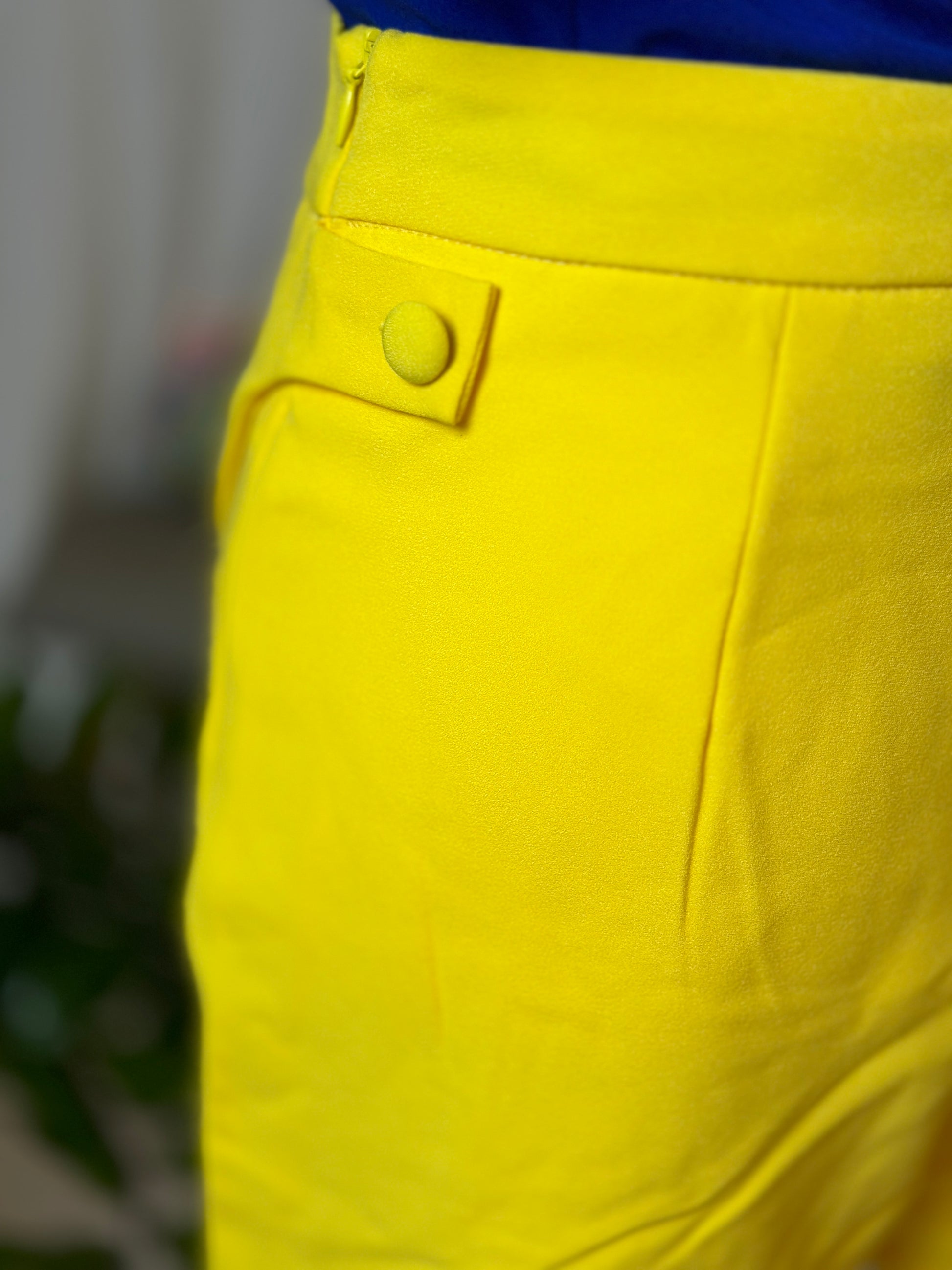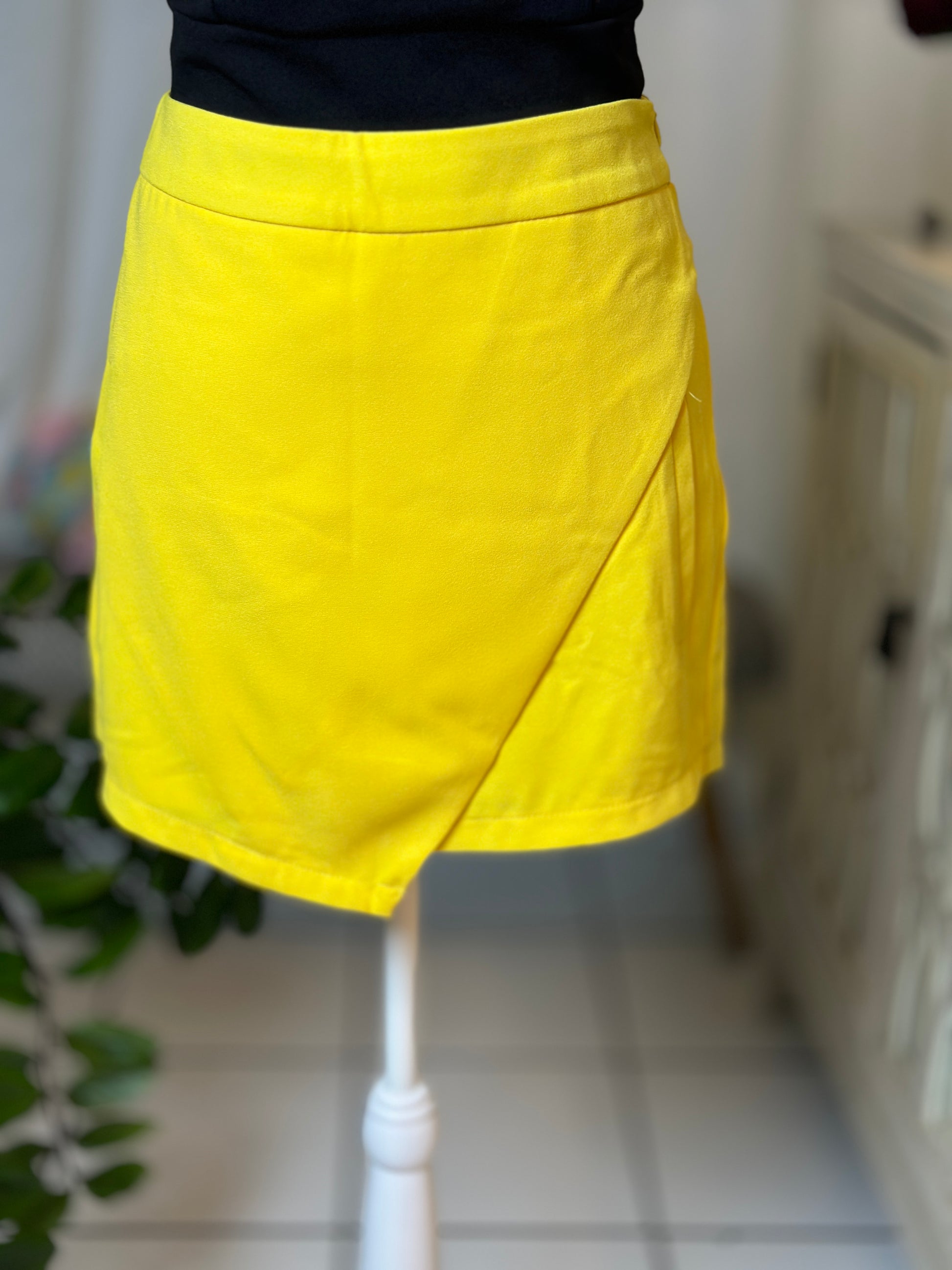 Achieve the perfect blend of casual and elegant with the Destellos Yellow Skort. This striking amarillo skort features a non-stretch material and a zipper on the side for a unique wrap-style closure with a chic button finish. Step out in style and confidence with this must-have piece.